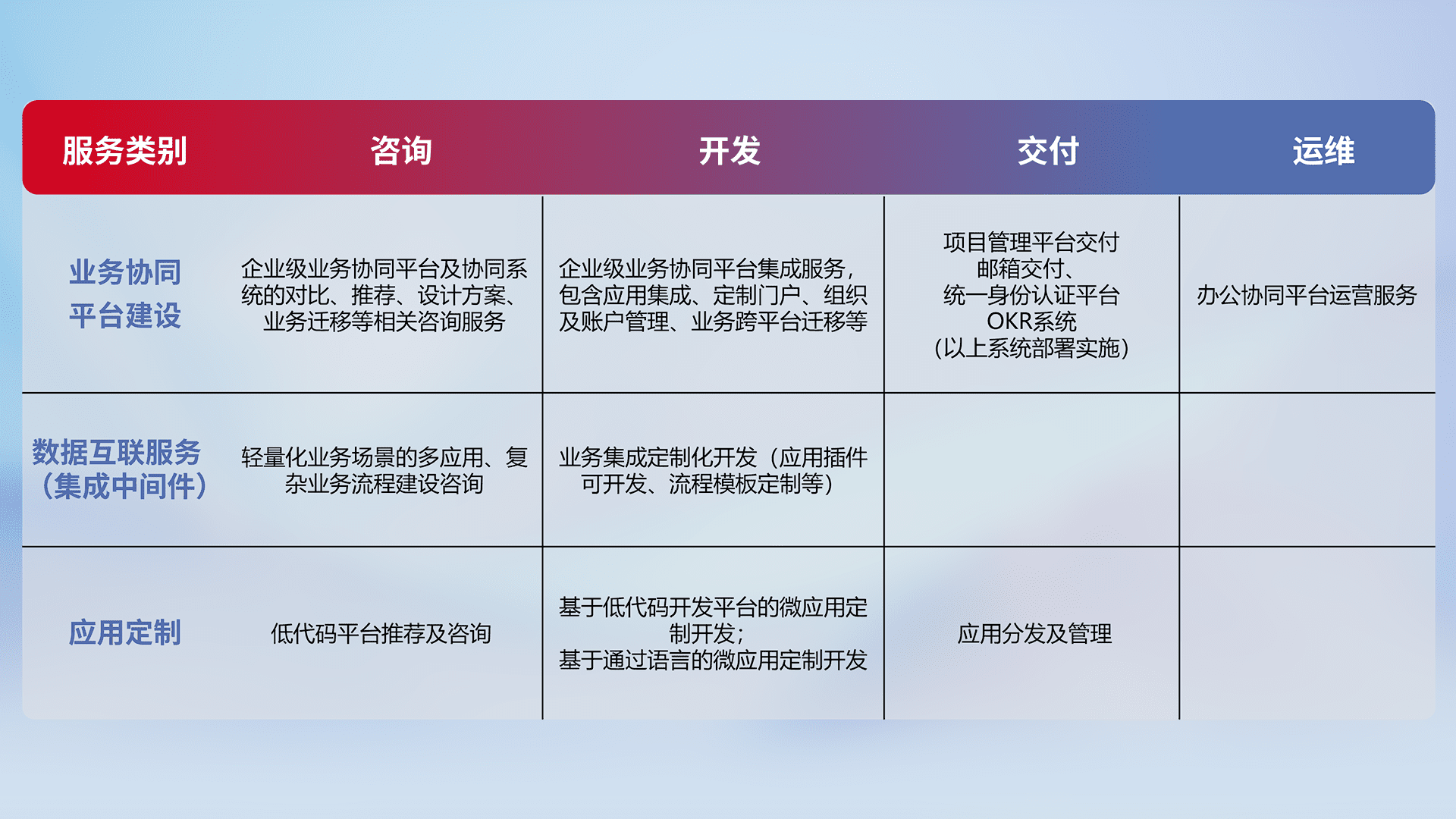 针对钉钉、、、、企微、、、、IDaas等平台级产品提供产品的规划、、、方案、、、、交付、、、定制化开发等服务,,,,实现如统一协同办公、、智能客户服务、、、、混合会议管理、、、、智能数据查询、、等业务场景,,,,实现数字化转型。。。