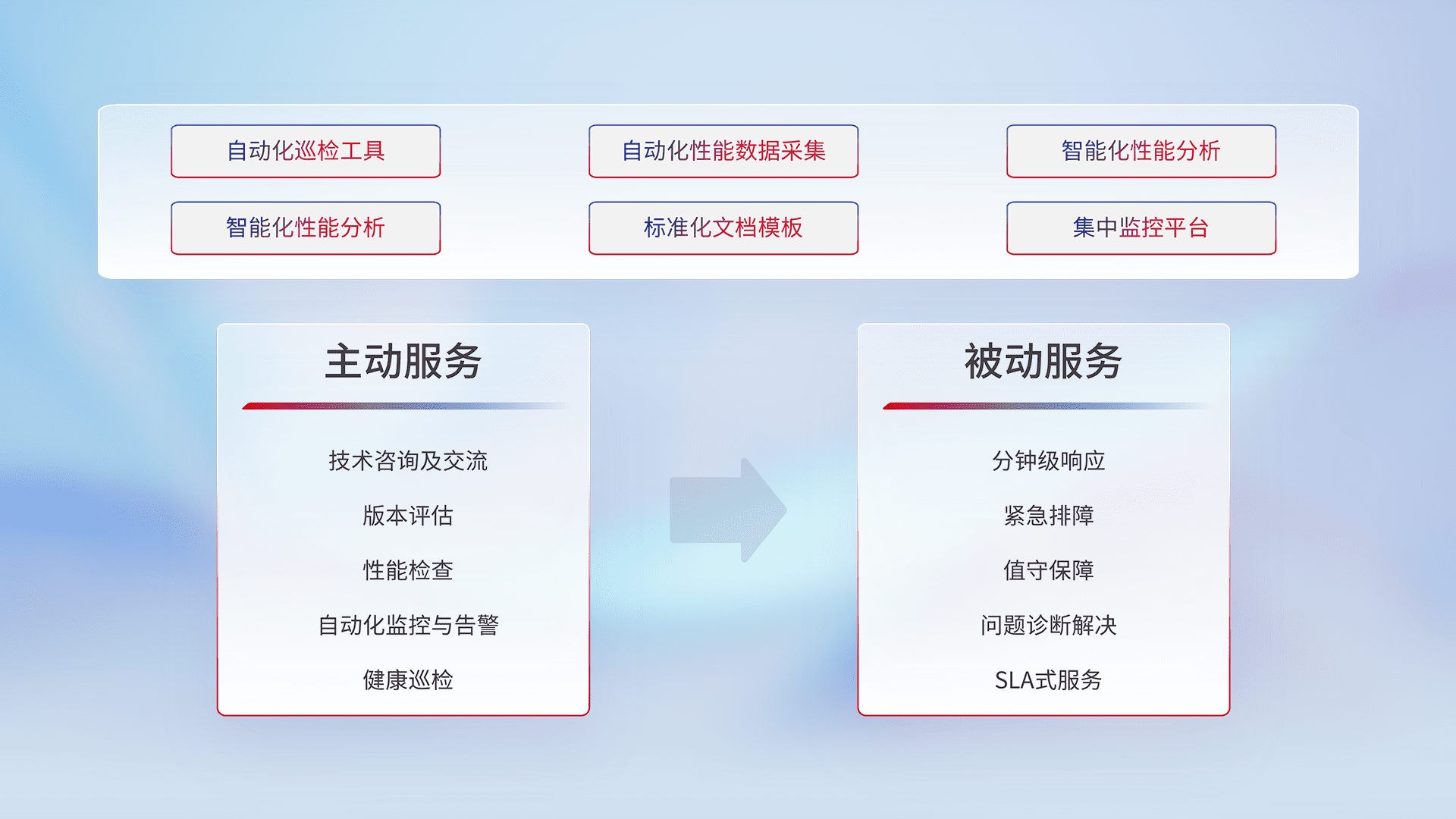 智能化工具和标准化文档,,,,保障服务质量,,,提供主动服务(包含技术咨询、、版本评估、、性能检查、、自动化监控与告警、、、、健康巡检)和被动服务包含(分钟级响应、、、紧急排障、、值守保障、、问题诊断解决、、、、SLA服务)。。。