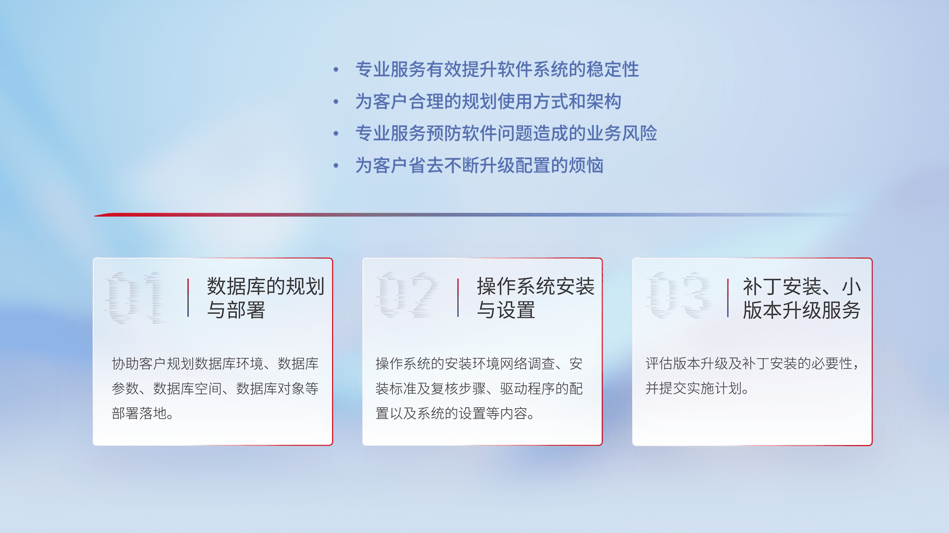 为客户提供软件规模升级、、快速部署、、、按需配置的专业服务,,,,从数据库的规划与部署到操作系统的安装与设置,,再到补丁安装和小版本升级提供支持。。。。